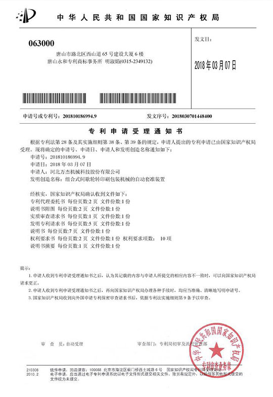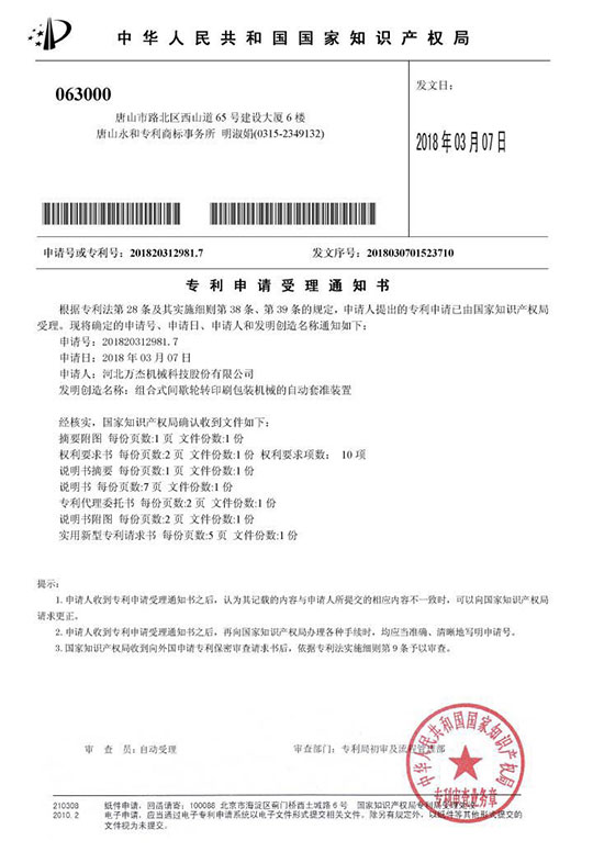 2018年3月07日,河北萬杰機械科技股份有限公司申請專利:組合式間歇輪轉印刷包裝機械的自動套準裝置